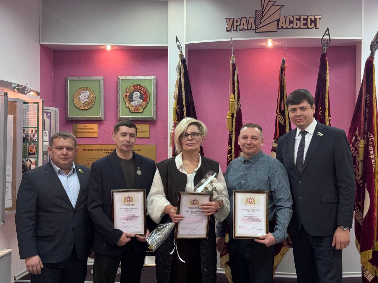 «Накануне 108-летие образования профсоюзного движения вместе с председателем профкома ПАО «Ураласбест» Леонидом Ремезовым поздравили активистов движения комбината,– сообщает Михаил Зубарев.– По поручению председателя Законодательного Собрания Людмилы Бабушкиной  вручил Благодарственные письма сотрудникам: Анастасии Акатьевой, ведущему специалисту системы менеджмента качества ПАО «Ураласбест», Денису Боровских, начальнику ремонтно-электромеханического цеха Асбестообогатительной фабрики, Сергею Храмцову, машинисту тягового агрегата Управления железнодорожного транспорта, Почётному работнику комбината».