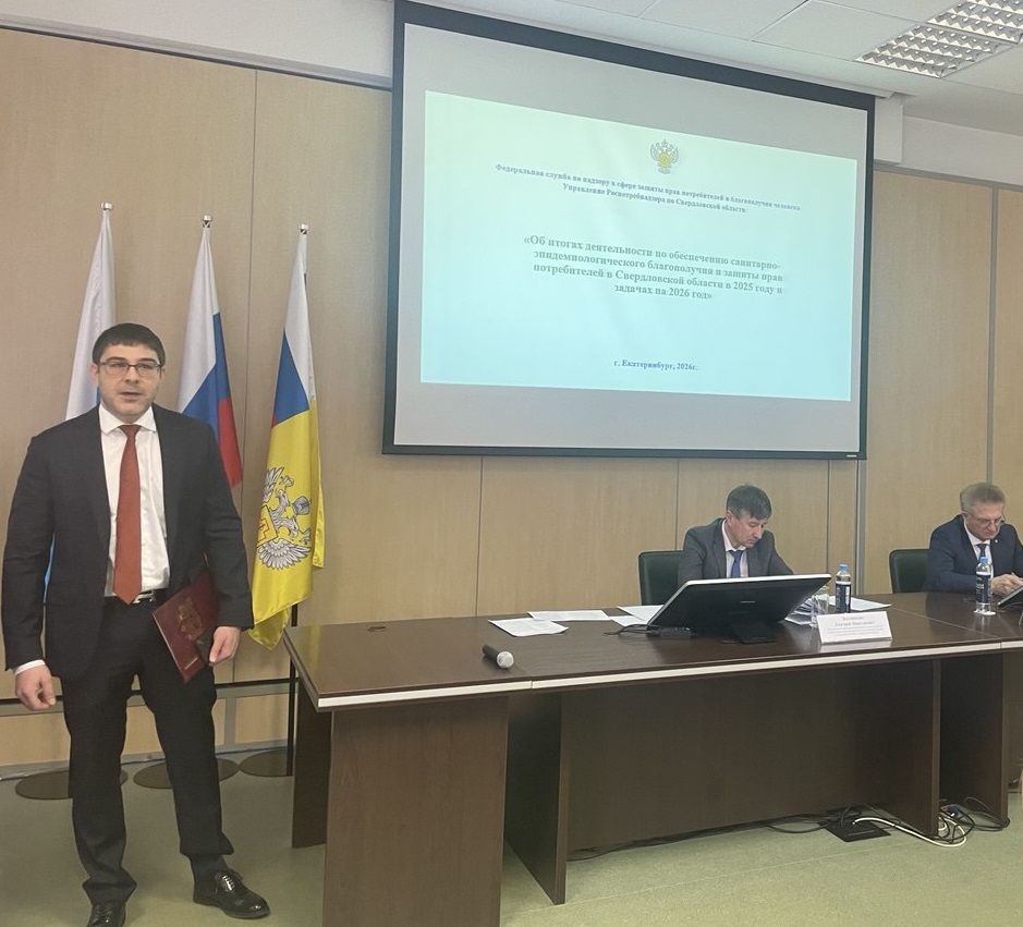 Леонид Хаютин принял участие в заседании коллегии «Об итогах деятельности Управления Федеральной службы по надзору в сфере защиты прав потребителей и благополучия человека и ФБУЗ «Центр гигиены и эпидемиологии в Свердловской области» в 2025 году. Задачи на 2026 год». Выступил с приветственным словом, а также по поручению Людмилы Бабушкиной вручил благодарственные письма Законодательного Собрания за многолетний добросовестный труд и высокий профессионализм специалистам Управления.