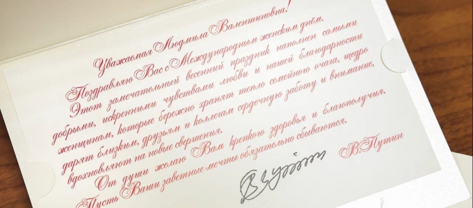 «Поздравляю Вас с Международным женским днём. Этот замечательный весенний праздник наполнен самыми добрыми, искренними чувствами любви и нашей благодарности женщинам, которые бережно хранят тепло семейного очага, щедро дарят близким, друзьям и коллегам сердечную заботу и внимание, вдохновляют на новые свершения. От души желаю Вам крепкого здоровья и благополучия. Пусть Ваши заветные мечты обязательно сбываются», – сказано в телеграмме Президента России.